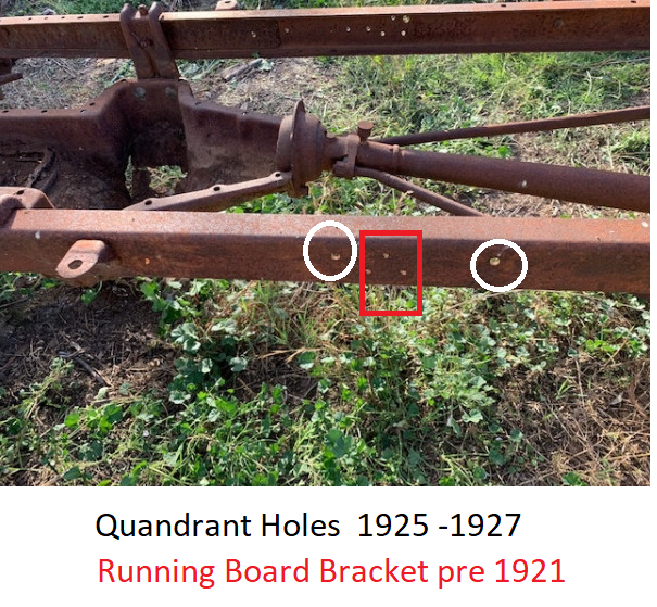 1) The three triangle shape holes for the early forged running board brackets but no additional holes for the later channel steel brackets would point to pre 1921.