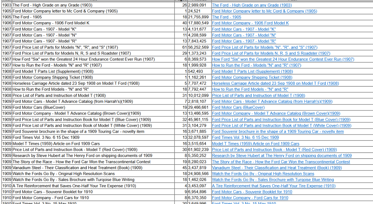 The FORD Digital Library consists of many original Ford Model T manuals, publications, part lists, literature, and related material. There are over 650 pieces of printed documentation that has been donated by the folks that are determined to see that a broad level of people have access to this information.