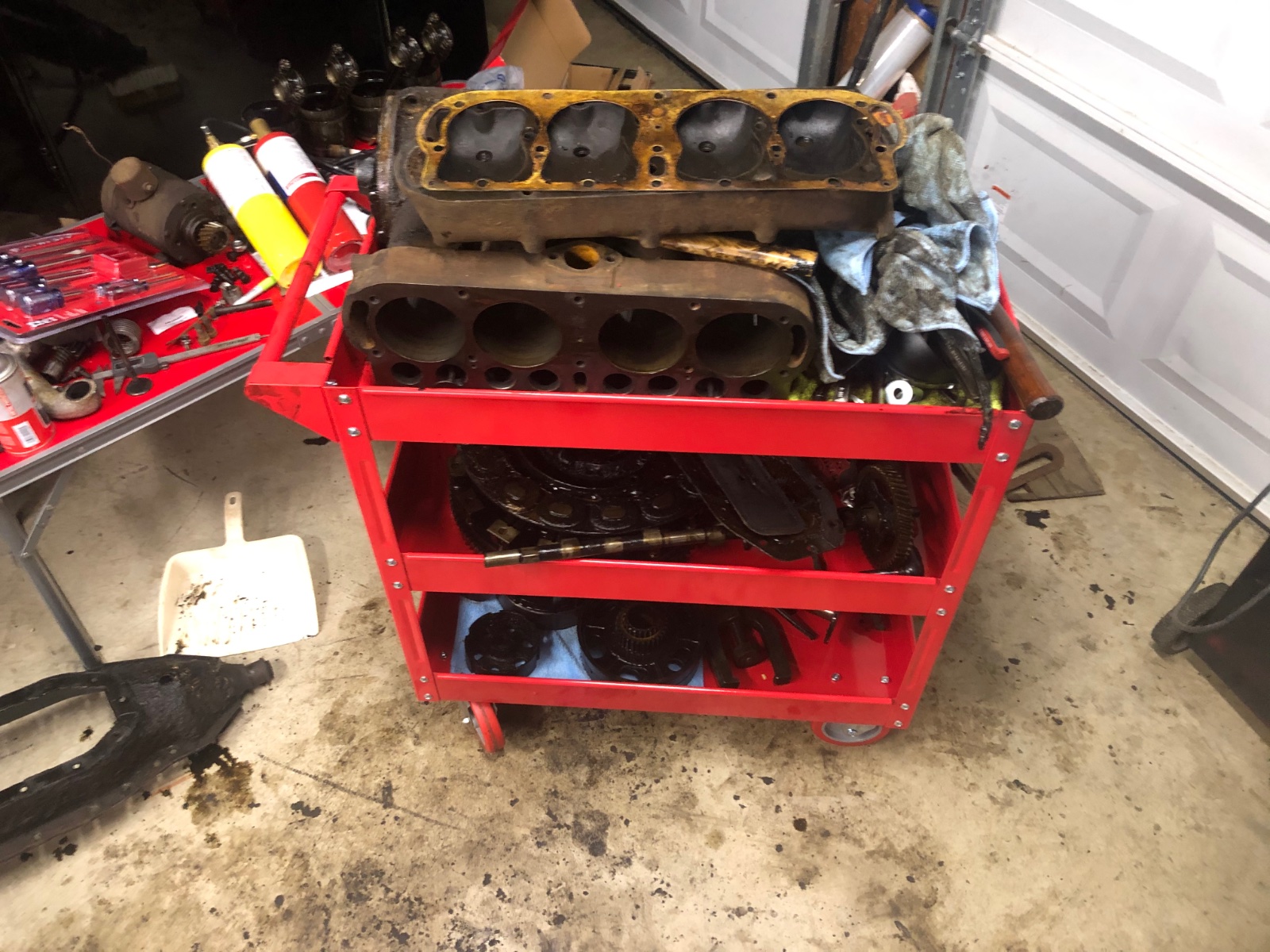 Thanks to a buddy the TT engine is out of the chassis and stripped down! In case anyone was wondering, a model t engine minus the pan and hogshead will fit on a horrible fright 3 tray shop cart. Now time for cleaning.......lots and lots of cleaning.