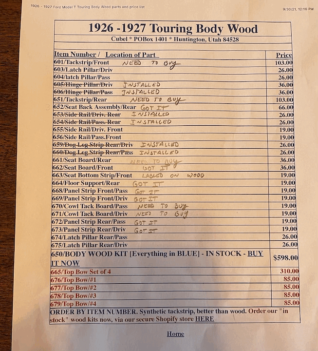 You may want to find a T Body parts book. They have the wood shown in them.