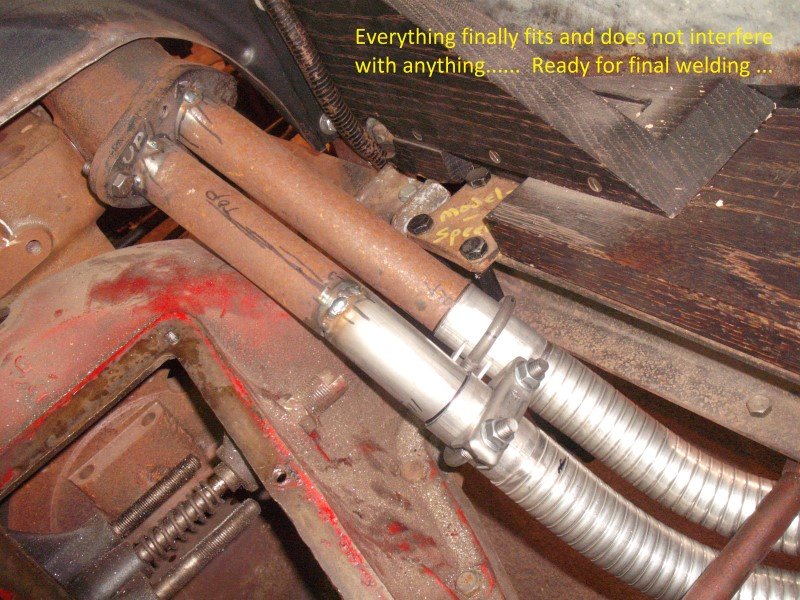 Because Duncan and Fraser lowered and set the steering column sideways on my wide body roadster, there was enough clearance to allow me to use the dual exhaust manifold on my RHD car. However, to simplify getting the pipe to the rear past the pedals and the starter switch on the floor, I siamesed the two pipes from the manifold into one larger one before sending the pipe to the rear. It gives a nice throb to the note rather than a real noise, as befits this elderly gent's image!