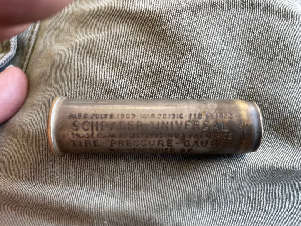 I was digging around in a somewhat hidden compartment under the seat and to the left of the gas tank on the ‘25 express wagon I bought last summer and found what I first thought was a large caliber shell casing but turned out to be a Schrader Universal Tire Pressure Gauge. I tried it out on a bicycle tire I measured at 56 psi with a trusted gauge and got a reading in the low 40s. I couldn’t get it to seal on the bicycle’s tire stem but at least it works! Is the seal around the measuring port replaceable? The seal retainer appears to be threaded, thus removable, but I didn’t want to take it out without more information.