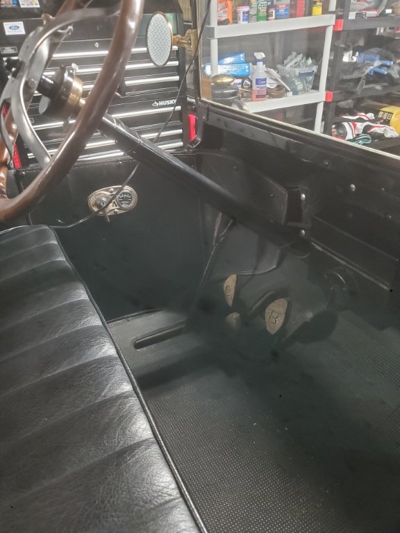 Your Model T ‘s touring car body is from 1922. The 3 panel back section with the rear 2 man top brackets going threw the body, plus the front top brackets that are dropped down are typical 1922 production. Your windshield is 1915-16 and the coil box with the switch is late teens. It wouldn’t be to hard to change out the coil box to a 1922 type with out the switch and add a 1922 dash and instrument panel with the key and amp meter, going back to stock wire loom and loosing the 1926 instrument panel in side panel. I wouldn’t worry about the hole in the side panel where the 1926 instrument panel once was. Make a pocket with a hidden back flap that goes into the side panel where the 1926 switch was. This is where you hide your hip flask from the feds, it is 1922 and gin is not allowed anymore by the US Goverment.