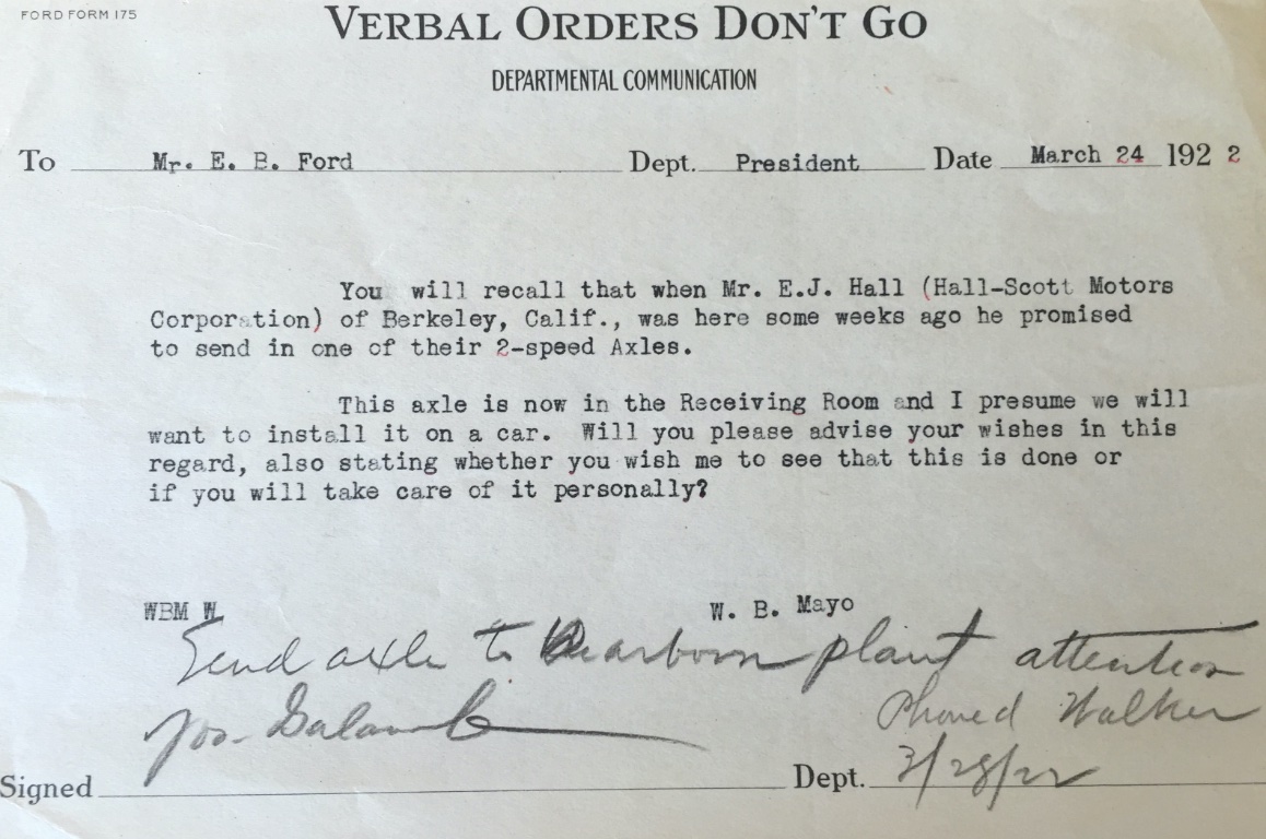 As for Edsel Ford, he did meet with Hall about those new Ruckstells in 1922, and was shipped one from CA to Detroit. His notes on the memo are written to direct this item to Galamb, what happened? Did Edsel ever try it out? Did a Ford car get this installed to test the axle, was there any documented results or actions???? Who knows!