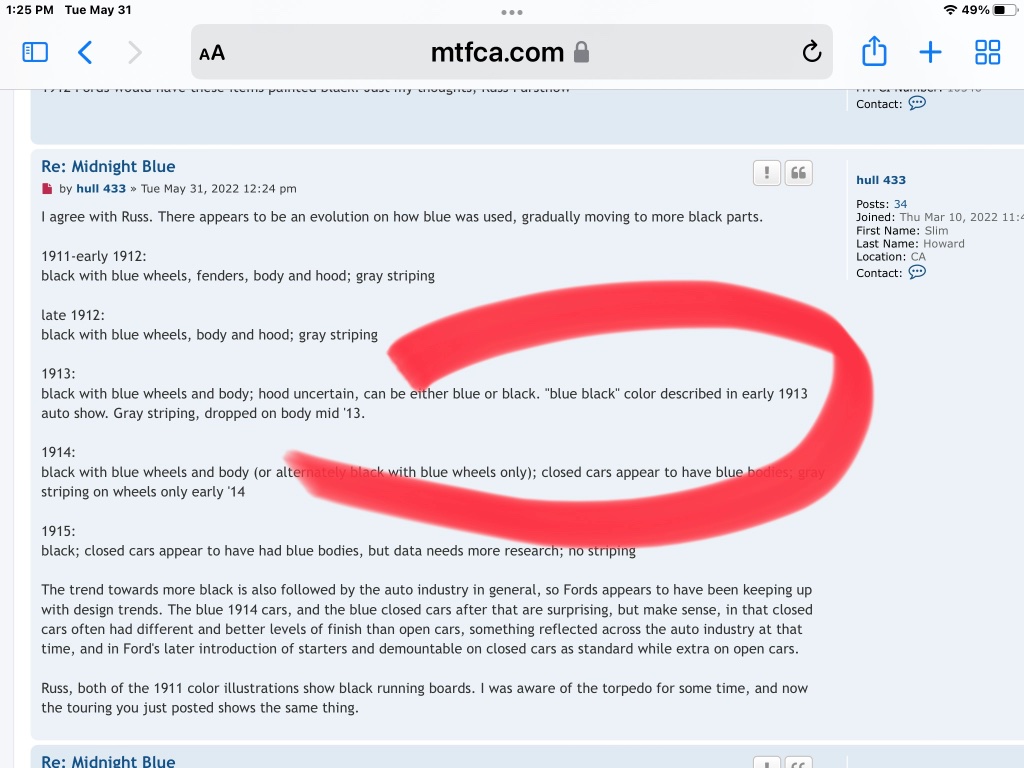 Slim, you write with a lot of ford authority but I still see nothing other than your opinion, and some aged paint chips. There are maybe more blue 1912 fords around this area, than other places. They are all a bit different and all are beautiful. IMHO