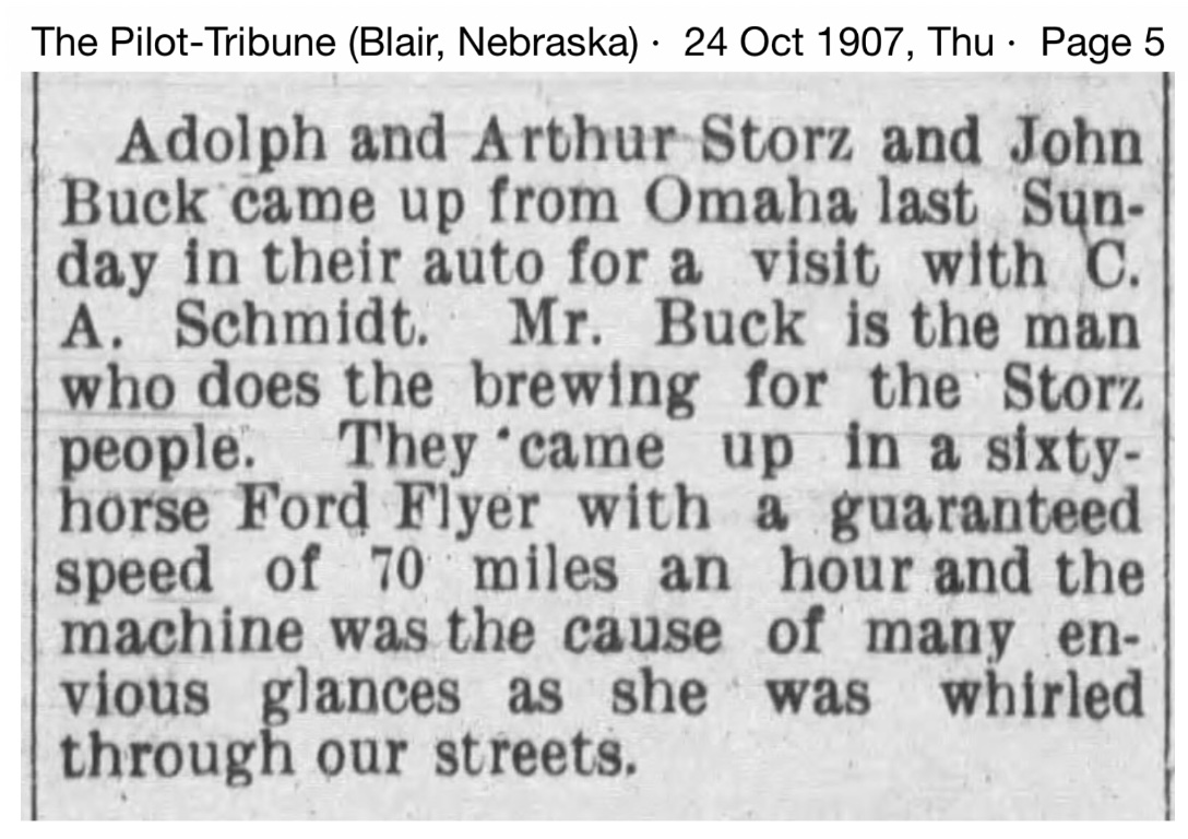 In October, 1907, the Storz brothers and a friend visited Blair Nebraska, north of Omaha, in their "Ford Flyer;"