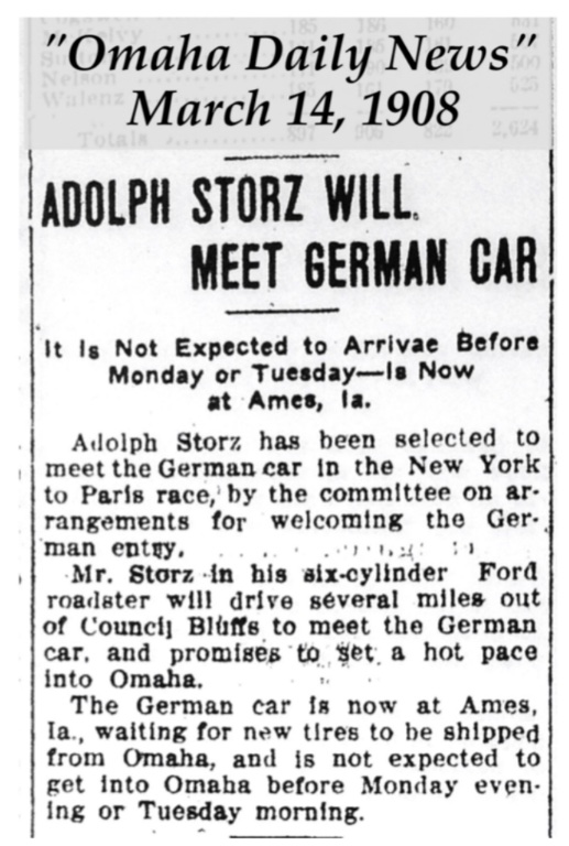 Model K #808 had a few more important events while in Nebraska. The Storz met the German Protos racer in the New York to Paris race in 1908, and piloted it across part of eastern Nebraska:
