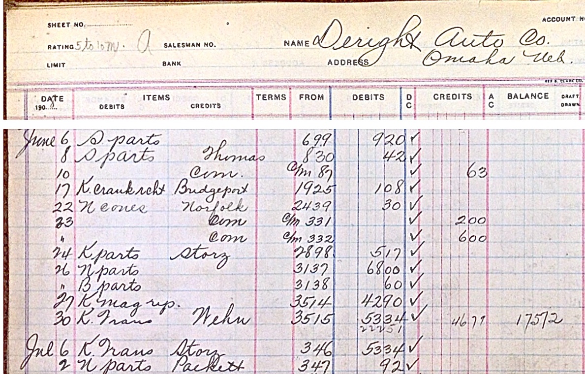 Below, excerpt from the Omaha Ford agent 1908 parts ledger. The Storz K gets parts, including a new transmission: