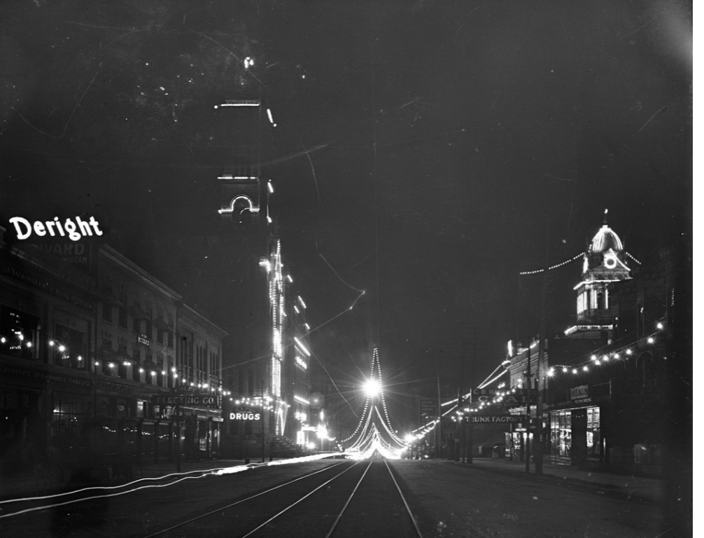 Here is a nighttime photo of Deright Automobile Company in Omaha. It was taken in 1912. It looks like "Deright" was written on the negative but that is where the building is located.