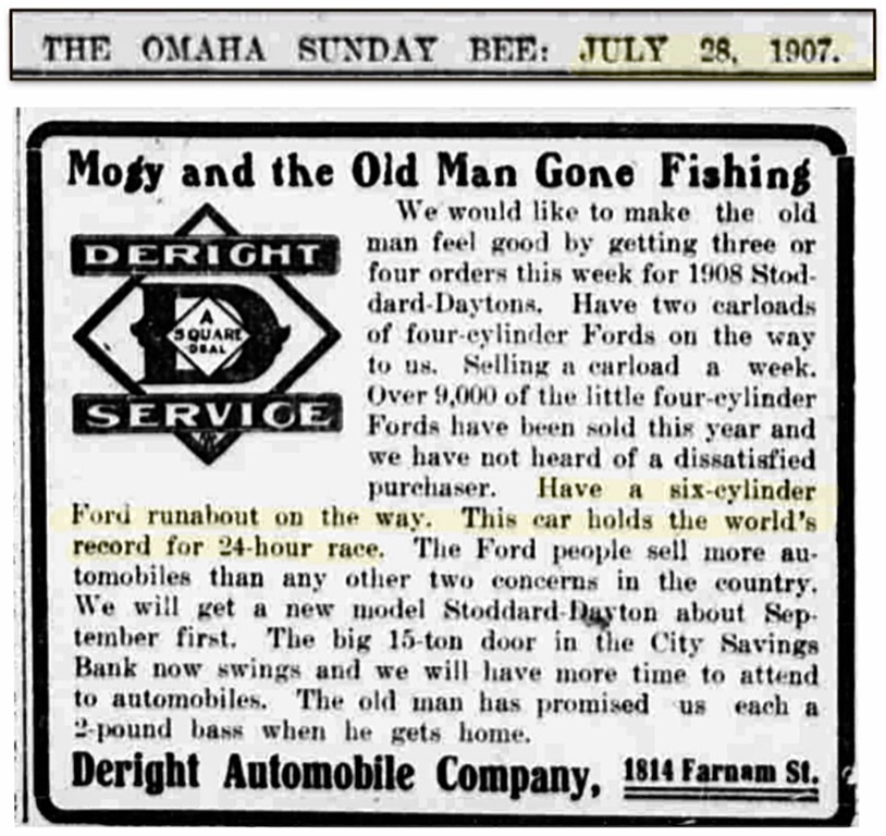 Deright also mentioned in his Omaha newspaper advertisement on July 28th, 1907 that he had a Ford six cylinder Runabout on the way: