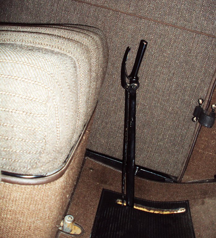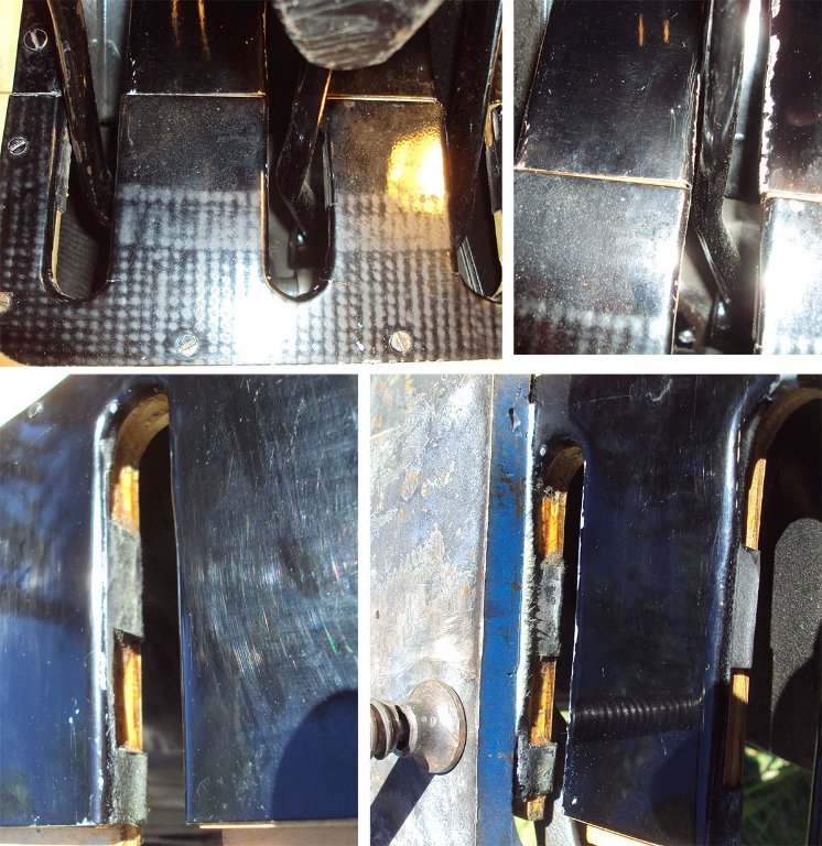 In addition, I found the play from worn clevis holes accumulated to 1/8”. Shims are hardly the best solution but that was my choice for now. I also discovered that the floorboard was stopping the brake handle from making its full travel of disengagement. Filing the hole a bit longer solved this problem. I trimmed the carpet to match. Now, with the brake lining worn more round, the shorter rods and the hole in floorboard enlarged I can achieve locked brakes before the handle meets the seat and no drag in the released position. While the floorboards were out it was a good time to address a reverse pedal problem I was having. The pedal would sometimes stick in the engaged position and not release without pulling it back with my foot. Due to the cam action it was contacting the floorboard trim plate in the engaged position. By clamping a plate firmly to the floorboard I could tap it closer and give the pedal more clearance. Previously I had been putting grease on it to keep it from binding.