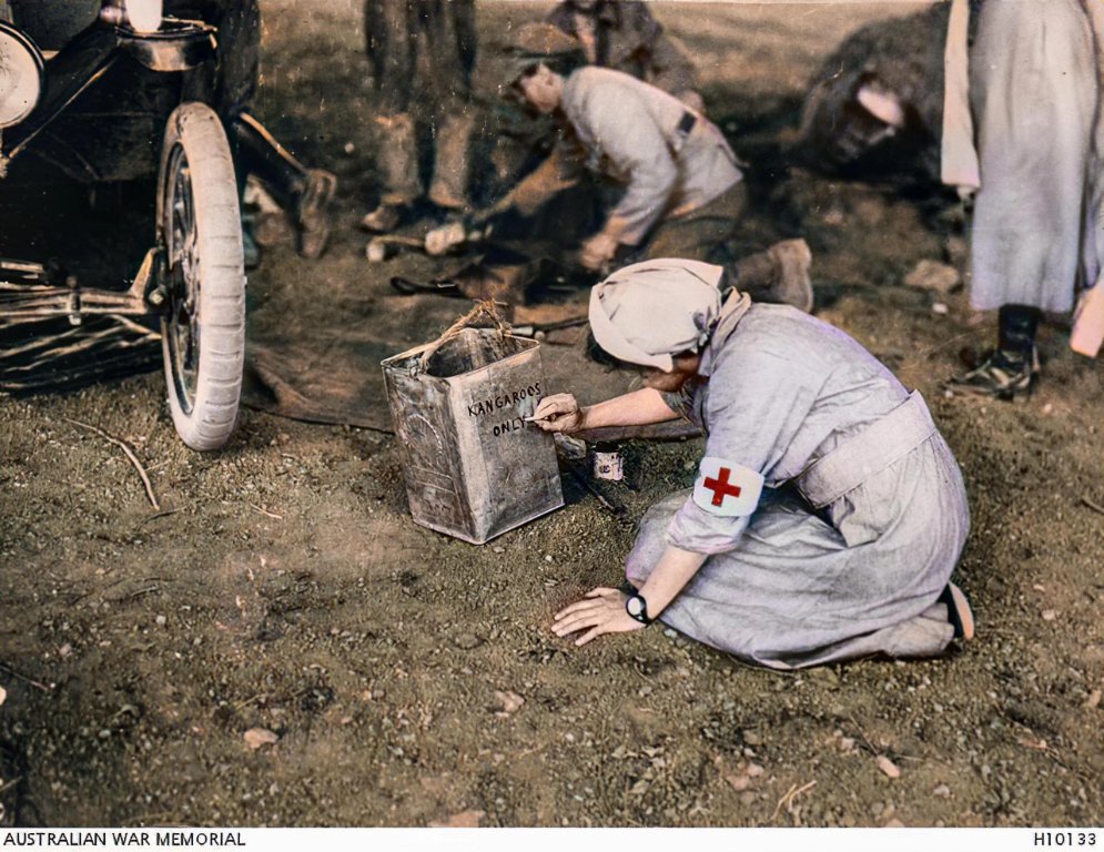“KANGAROOS ONLY” being painted on a water can by a member of the Scottish Womens Hospital. Serbian front. c. 1914 – 18