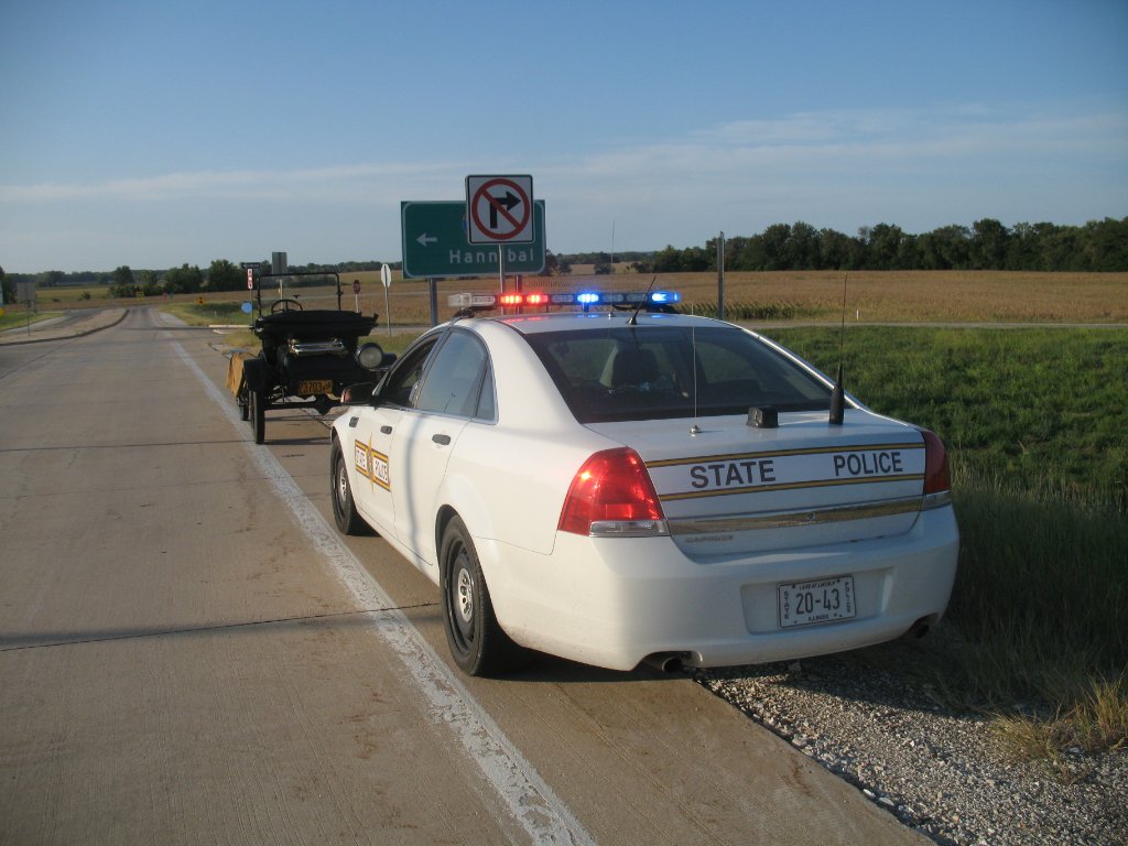 Unfortunately there are some places where the interstate is the only road. One such place is crossing the Mississippi at Hannibal. There are secondary roads on both sides of the river, but the I-72 bridge is the only way to cross. What to do? I phoned 911 and asked for a highway patrol officer to follow me with his lights flashing. There was an officer nearby and he followed me across.