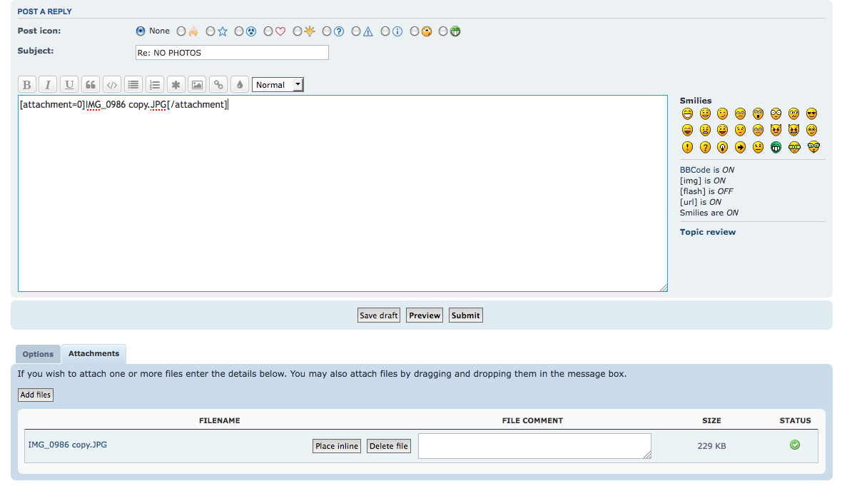 Click Preview. Your photo will appear in the Preview box. At this point you can add text in the composition box, or skip that and post only the photo. Click Submit and your photo and any comments with it will be posted.