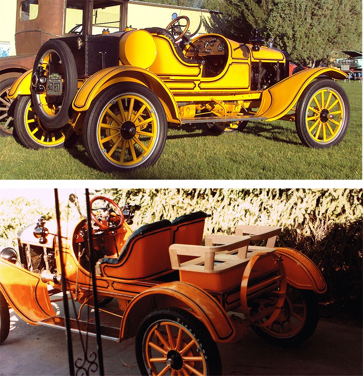 In the early 80's our Speedster was our Tour car. Our new son enjoyed tours on Joy's lap or cozy in a front pack. When our daughter arrived it was apparent we needed more seating. I fabricated a gas tank for the rear and made seats with folding back rests. I had seen a Pierce Arrow with that arrangement.