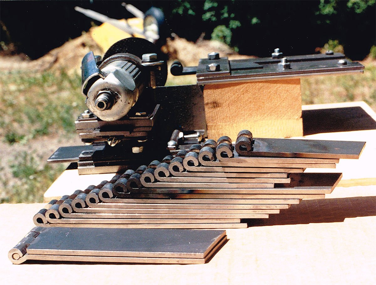 I found these photos of my hinge fabrication for my Yellowstone Bus. 6 doors = 12 hinges = 24 hinge halves. Thinking it was crucial to have precision in the slots and knuckles I made a sliding jig for my die grinder. It proved to be temperamental but it got the job done. The steel was malleable enough to just heat and bend. No annealing was done. They have worked well since 1989.