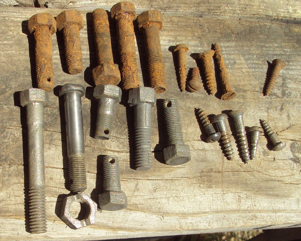 I mentioned I had bought 2 buckets of bolts at our Swap Meet. One was full of rusty ones that looked hopeless. I remembered a jug of muriatic acid I had on hand. After diluting some 50-50 with water the bolts were tossed in for 3 hours or so. Use precautions such as rubber gloves, eye protection and a well ventilated area. It would be good to read up on the dangers before using it.