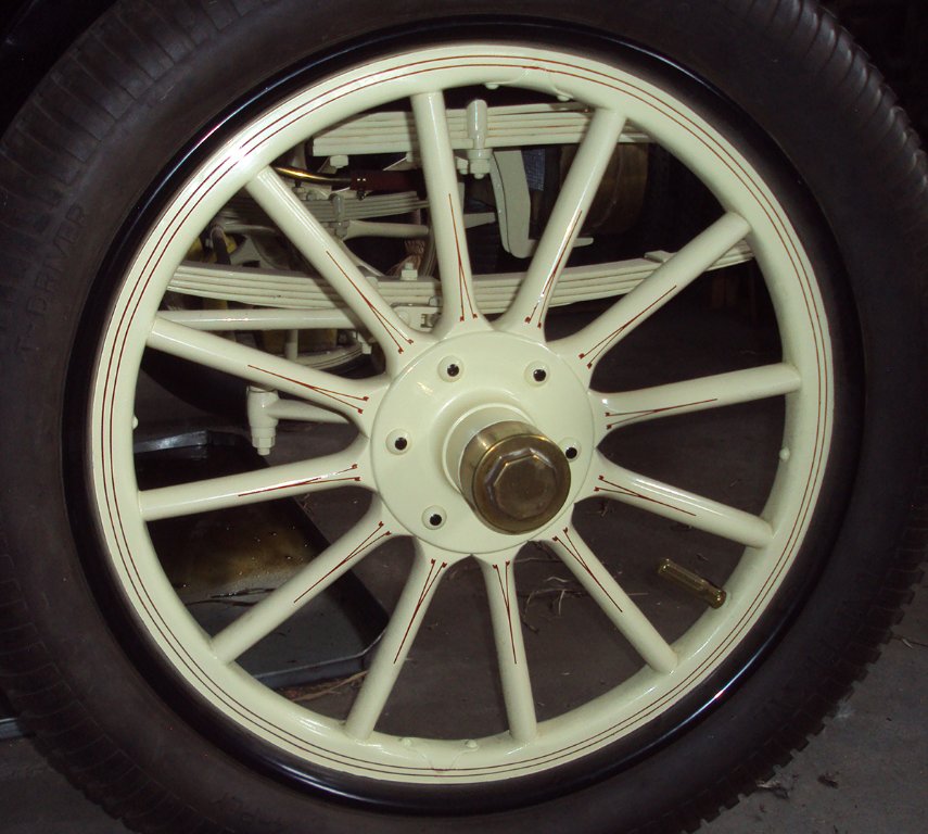 My 2 cents worth was gleaned from researching wire wheel colors for my last '26 Touring. Factory wire wheels were to be supplied by the dealer on an exchange basis. For a nominal charge dealers were to offer color to be applied by the dealer with a brush, with a stripe to match. Thus, brush painted wheels are in fact the most correct option for finish painting.