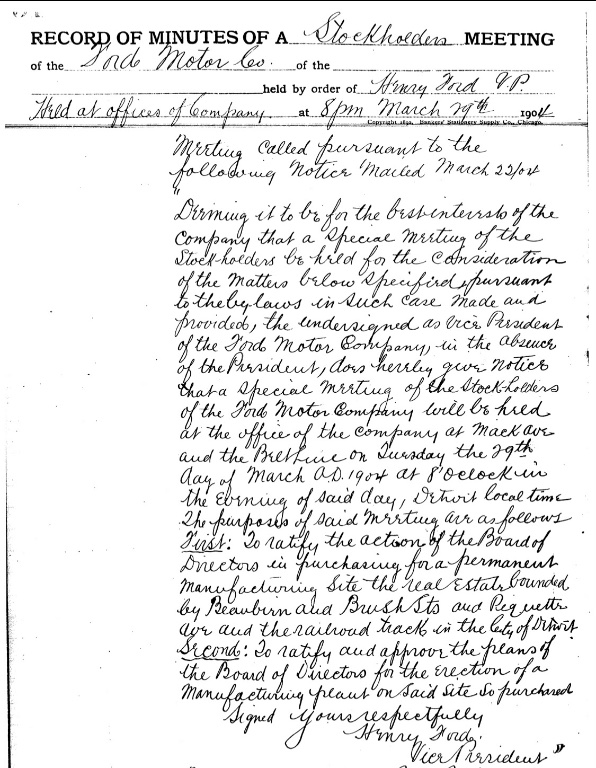 This page from the minutes included the notice, signed by Henry Ford, to shareholders notifying them of the special meeting: