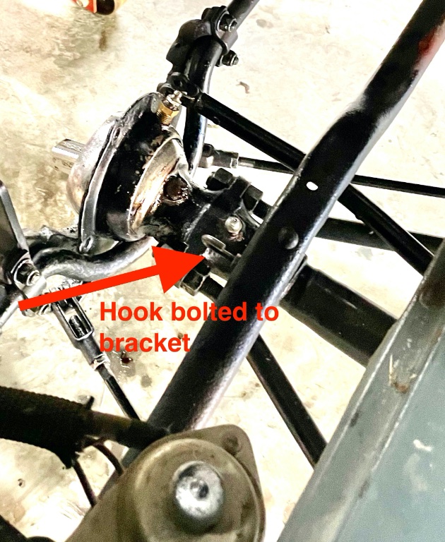 Use the running board cross bracket, don’t tell Original Smith, but drill a small hole and place bolt or hook to fasten the back end of the spring.