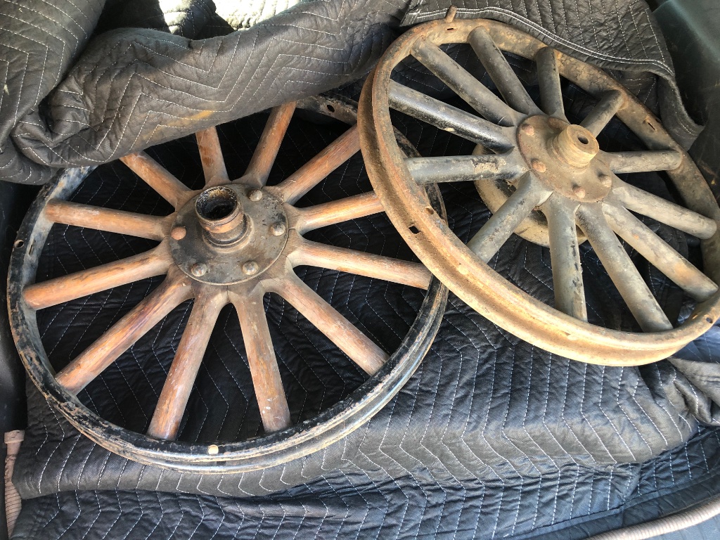 Mark, they look like the Kelsey loose lug wheels we have on most of our Canadian sourced cars. If so, the foot on the Hayes lugs will not clear the felloe because there is no relief pressed into the edge to accommodate it. Other fixed lug rims without the foot on the lugs may bolt up, but may still not sit on the felloe as they should.
