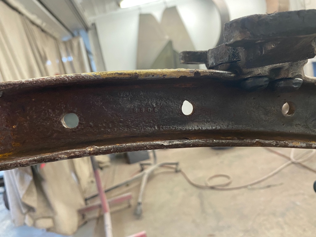 A number on the front axle. Again, the steel is nowhere as strong as a T, evidenced by the nicks and gouges made in the axle over the years. When pulling on the axle in a vise, I think one person would be able to cold bend it, unlike later models. This was the first Ford model with a solid I-beam front axle: