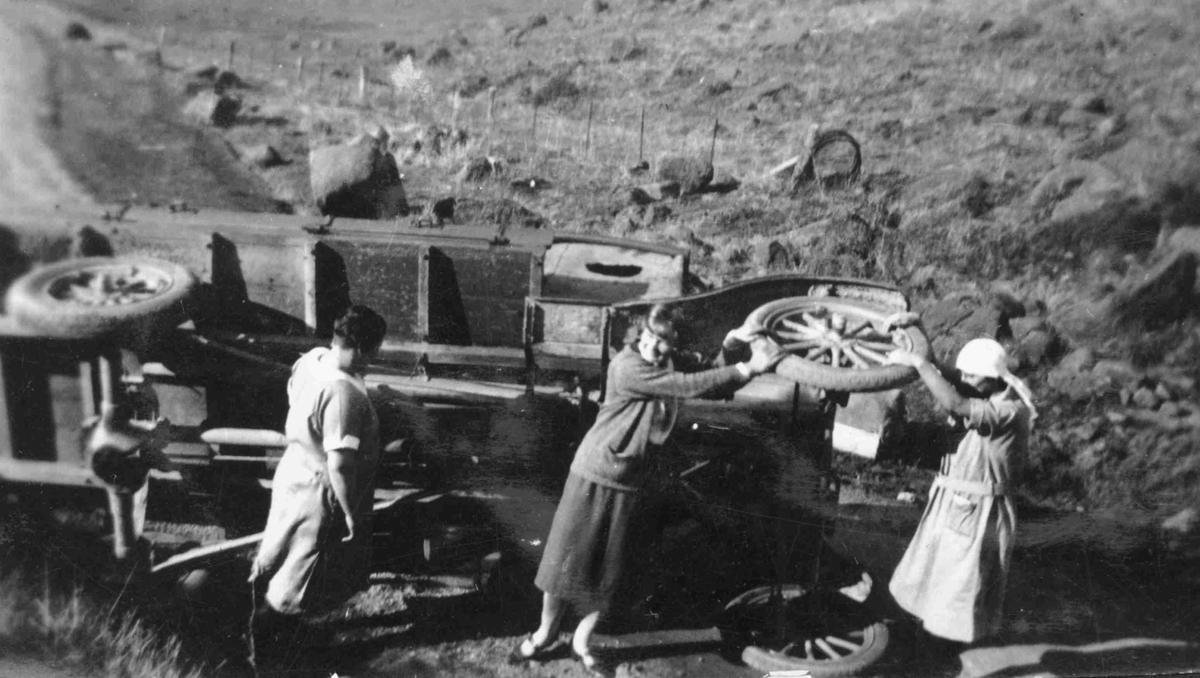 This is a TT farm cartage truck. You can see bales of wool behind the truck where they rolled down the hill. Two ladies do look like nurses, but I have no information as to why they are there.