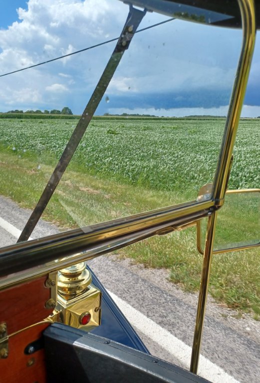 Took an old friend for a ride in Isabel my '11 Torpedo. Great run. On the way home noticed she was handling "squirrely". Wasn't the wind as there was none (yet anyway). Flat tire, right front. Oh goody! Pull in to a car wash that I happen to frequent with my moderns. As luck would have it, the owner, Nate Crnjak, who also owns North Coast Roofing in Sandusky OH, on the same site, just happened by and offered his AIR CONDITIONED shop to help! Good thing cause doe-doe head here forgot to out a jack in the tool box! On the way home I was chased by a squall line, I was able to outrun it.