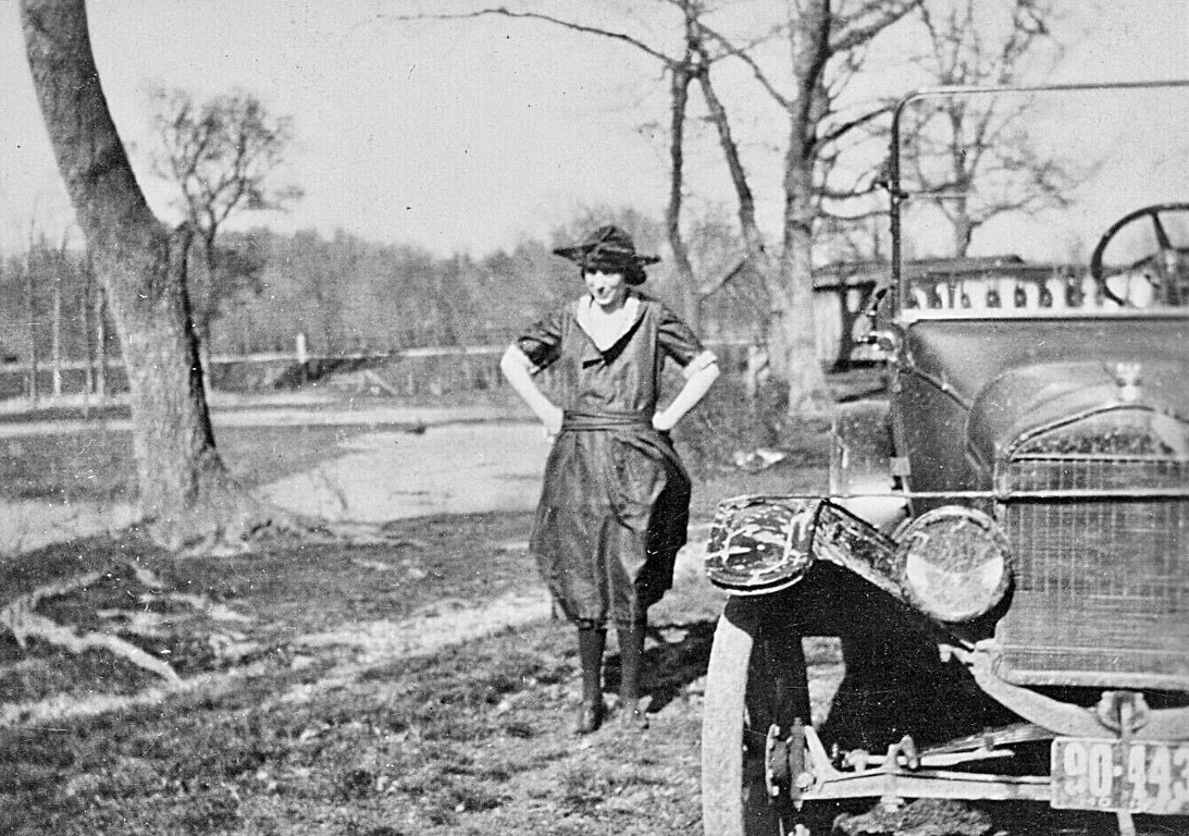 Tha is a nice 1909 roadster. Three tier E&J lights. Also a nice picture of the "Tree lover" the girl looking at her favorite tree.