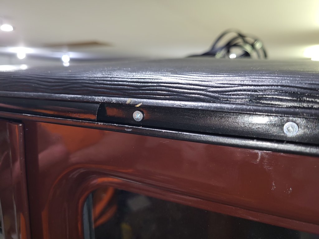 Photos of top installation. First photo is taking the original rain gutter apart. The inside piece was replaced with a piece of tape measure.