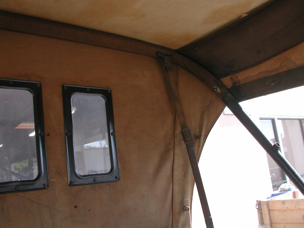 In that picture, it looks like the entire top is worn out. If so, you can order a kit from one of the vendors and include the pads. The straps and the pads should be installed first and tacked into position. The entire bow assembly is held in place by those straps inside the pads and the two which run along the middle between the pads. The height of the rear bow is pinned by the two leather straps and the two straps between them. This height should be measured from the back of the body, NOT above the ground. That way the top looks straight when the body leans in one direction or the other. The two center bows are spaced so that they are straight up and the front bow is set to go in front of the windshield. All adjustments to the bow positions should be made before the top material is placed. The cotton pads are then placed and the covering is stitched together. It needs to be stitched not stapled, because it is flexed every time the top is lowered. To me, this is the hardest part of the job. It took me several hours to do both sides. Then lastly install the top starting at the front and going to the back. The center of the top should be marked and also the center of each bow. The top is then centered with the mark on the top next to the mark on the bow. These marks can be made on masking tape so they can be removed after the top is in place. Pull the top tight in the sun on a warm day and then let it set for a few days. Check again to be sure everything is the way you want it, and finally trim the edges to fit half way on the front and the back bow, and place the trim.