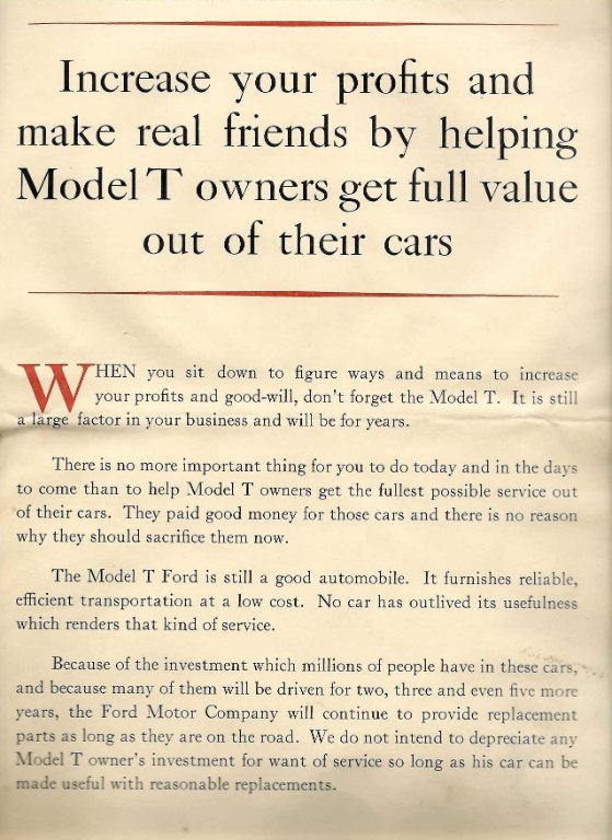 I recently found this Ford circular from 1929 that encouraged dealers to look after Model T owners.