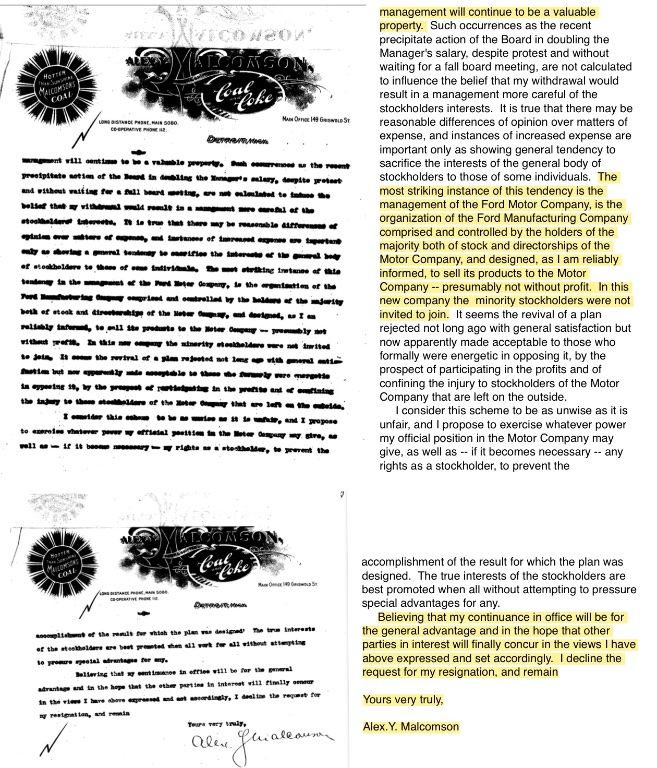 If you jumped ahead and looked into Ford Manufacturing, I hope a question comes to mind (it did for me). Malcomson's letter (below, page 2, middle highlighted paragraph) went on to report "the Ford Manufacturing Company comprised and controlled by the holders of both the stock and directorships of the Motor Company."