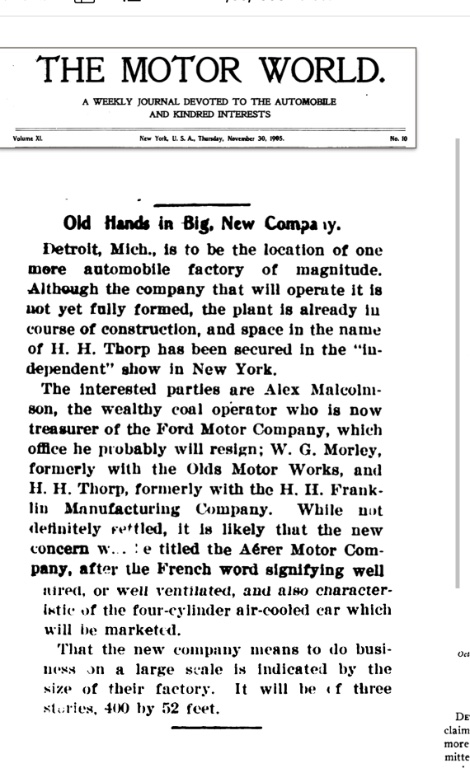 While the earliest I believe Henry Ford and the other directors learned about Malconson's Aerocar, "The Motor World" was running at story dated November 30th, 1905, making it the earliest I've found of the new venture. It appears Malcomson was ready to get the news out to the world. The article states that Malcomson "probably will resign" as Ford's treasurer: