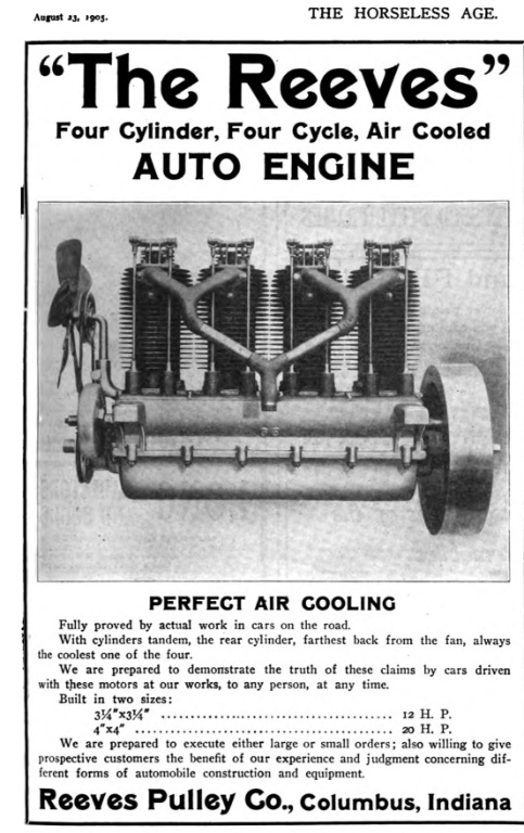 Below, August 1905 Reeves Pulley advertisement for the air cooled motor Malcomson chose to power his car: