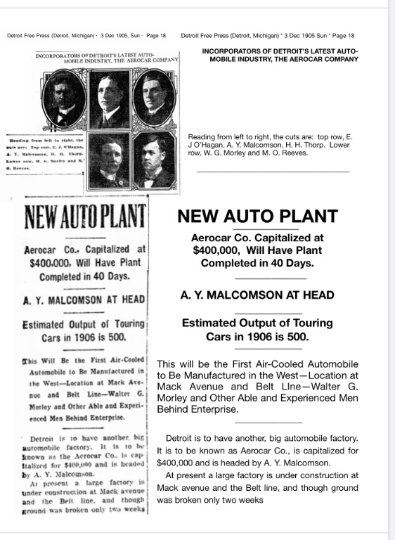 On December 3rd, 1905, the news breaks. Detroit will have a new automobile producer, and plant, in forty days. Aerocar is announced, with Alexander Y. Malcomson at it's head.