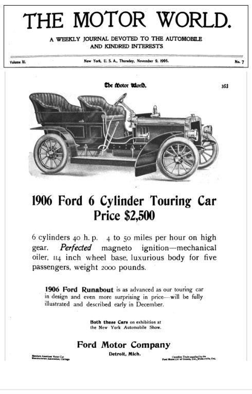 Ford Motor Company had begun advertising the upcoming models for 1906. This early November 1905 advertisement describes the upcoming Model K, including Ford's own "Perfected Magneto," as well as price. Details on the Model N, including price, were not as detailed, but described: