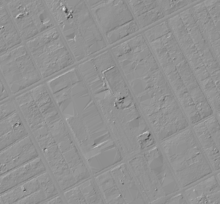 This may take a little working out (and it may also not be that interesting or useful!) but here is a hillshade model of what I believe to be the ground elevations for the site in question. To be clear, this is what the ground looks like, without buildings.