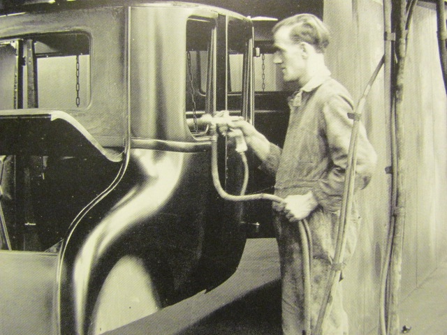 Prior to "spray guns" the cars were flow painted. Excess paint captured underneath, then pumped up above and reflowed, by gravity. Notice the guy on the left doing the back. Picture is circa 1914