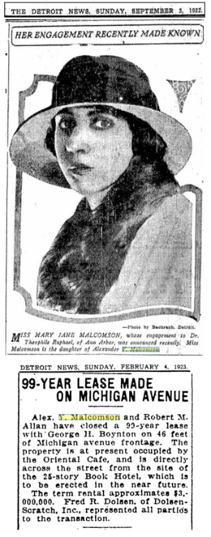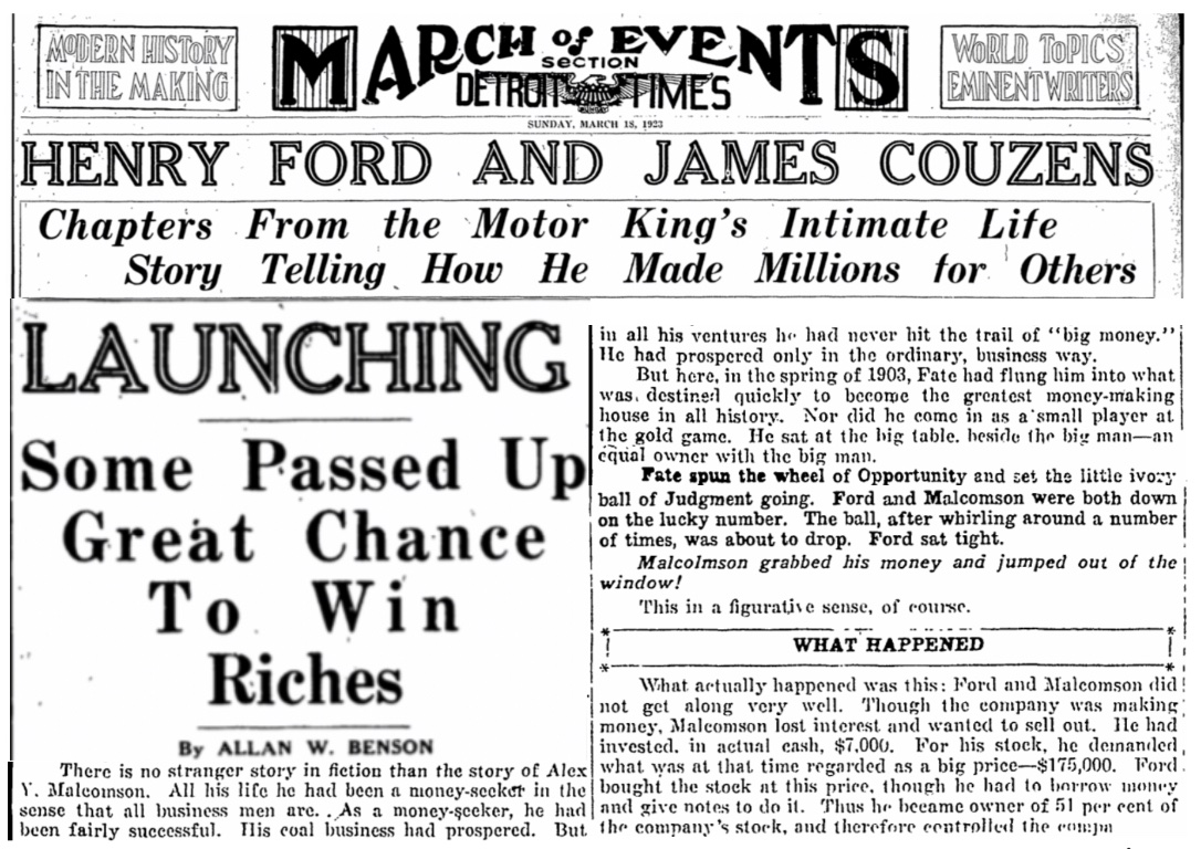 My guess is these were difficult years for Alexander Malcomson. Authors such as Allan Benson were writing biography's about the wealthiest man in the world, Henry Ford, and Malcomson's name was always included in the story of Ford Motor Company. I suspect to Malcomson's dismay, the story of his involvement and exit from FMC usually wasn't flattering. Below, the Detroit Times ran excerpts of Benson's book on Ford, including less than a less flattering profile of A. Y. Malcomson's early involvement in the company, and how he left riches on the table, exiting the company early: