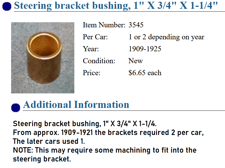 Reno Speedster wrote: ↑Sat Sep 03, 2022 12:36 amWhile working on my Steering, I discovered that my lower steering bracket (marked T932B and Ford) only has one bronze bushing in it. I managed to screw that bracket up in the process of trying to remove the bushing (best not to ask how) and found another one with the same markings and it also has only one bushing in it. All the sources I have say that is the correct bracket for my 22 but they also say that it should have 2 bronze bushings. I have seen mention on line to later production brackets with this number only having one Bronze bushing. Is this true, if so when did the change occur, and most importantly is there any benefit to having two bushings rather than one? Inquiring minds want to know…