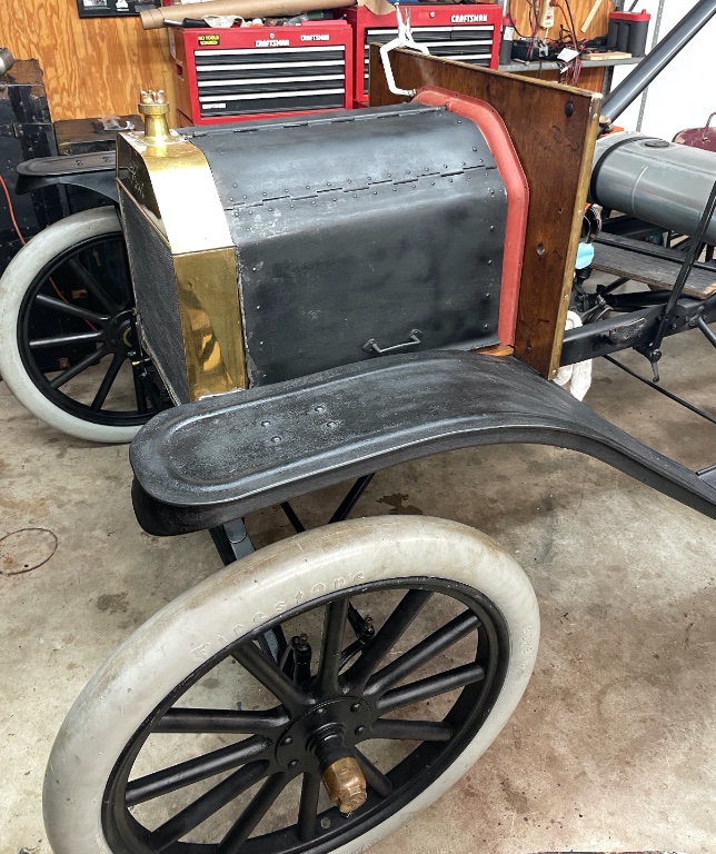 The running gear was pieced together by the late Mel Miller. It has lots of interesting parts from various years on there. I had to come up with a year model for the DMV. I looked it over and spotted parts which were identifiable with the help of Bruce’s book. Chose the year I wanted the title to say and pointed out that part to the disinterested DMV employee.