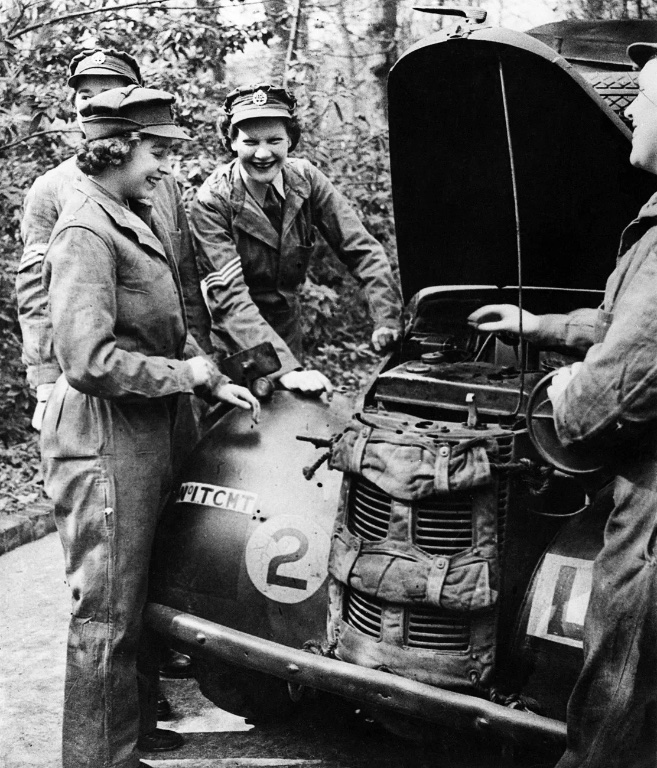 Princess Elizabeth, a second subaltern of the Auxiliary Territorial Service, trains as a mechanic in southern England, April 1945.