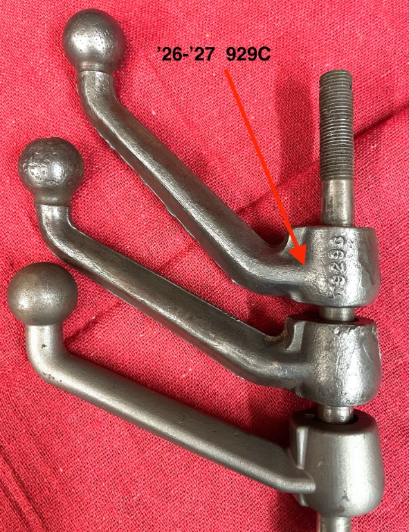 The earlier (about '13 - '25 Ball Arm is T-3547, Factory Number 929B. The reproductions are the 929B shape, repro shown in foreground.