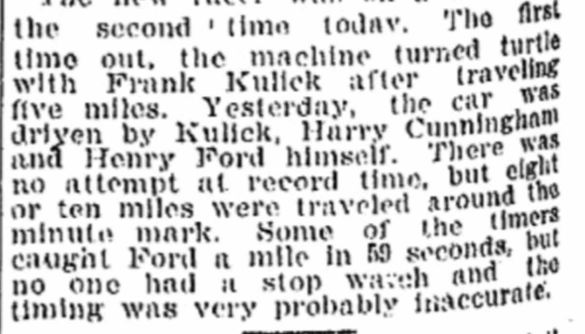 To be continued.... in a few days, Kulick drives the racer again, and Henry Ford makes his last known timed trip around a track.