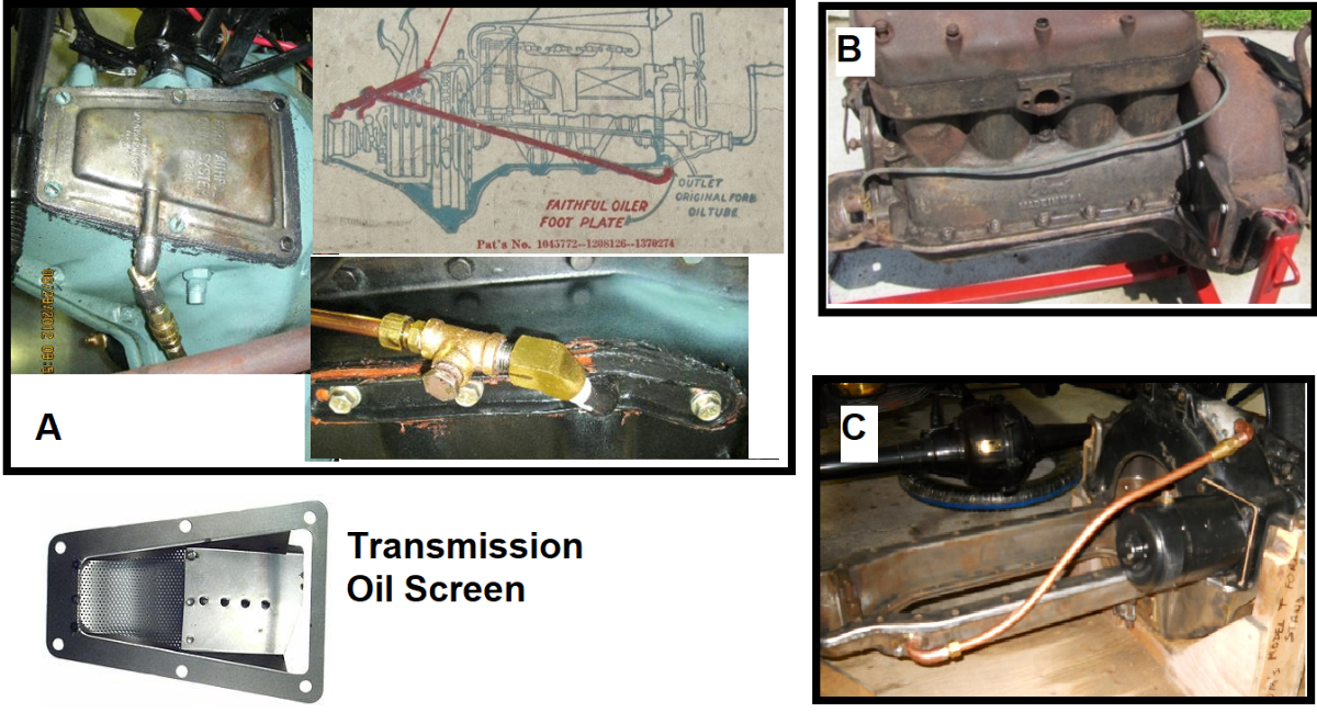 Some pictures of where some kits were applied A = Ford Faithful, B = Magneto Pickup and C = High Volume. The Ford Faithful incorporates a transmission oil screen while the others could purchase one separately. --