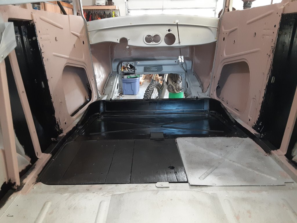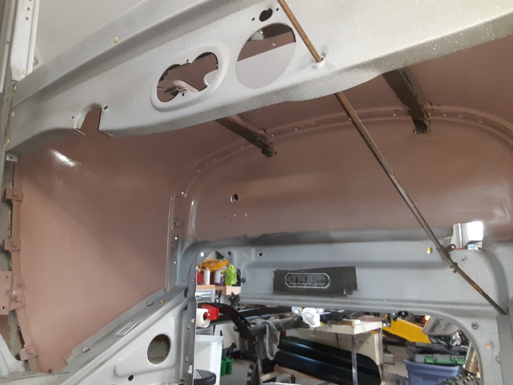 The surfaces inside the body have been painted: I prime painted the surfaces, that will not be visible after the upholstery is installed, with a brush. This was done prior to taking the body to the professional painter. The surfaces that will be visible were painted by him.