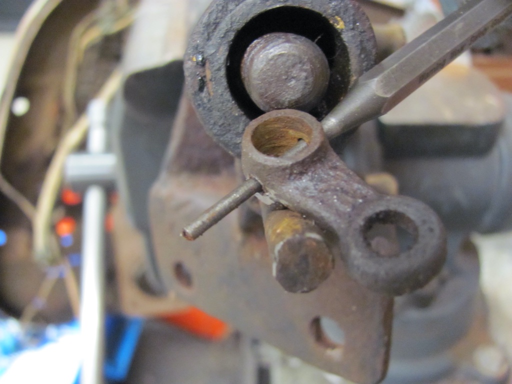 Remove the pitman arm and lower support bracket. Then, remove all the paint from the throttle and timer rods, since it doesn't belong there anyway, (same with the steering shaft), and it will impede the installation of the lever. Then, slide the lever onto the throttle shaft & pin in place.