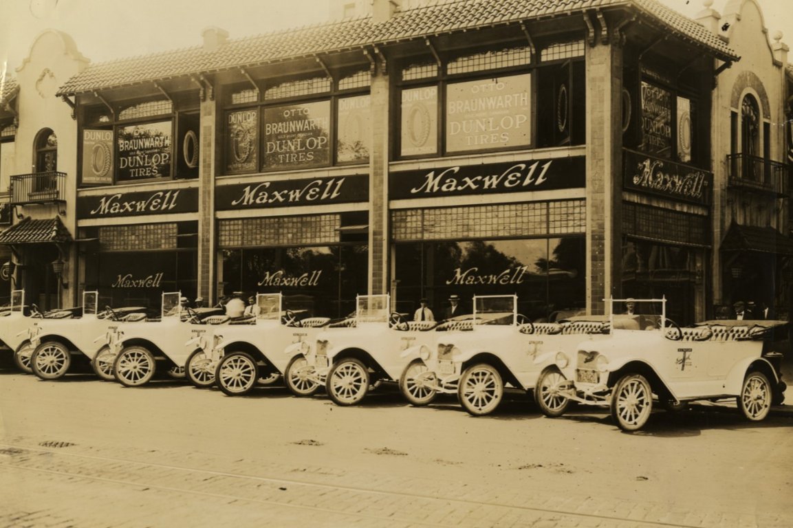 "Maxwell Motor Car Agency, Charles H. Rockwell, agent... located at 120 South Los Angeles Street (later Anaheim Blvd.), with a 1914 Maxwell Messenger Roadster and Touring car parked in front; "1914 Maxwell".