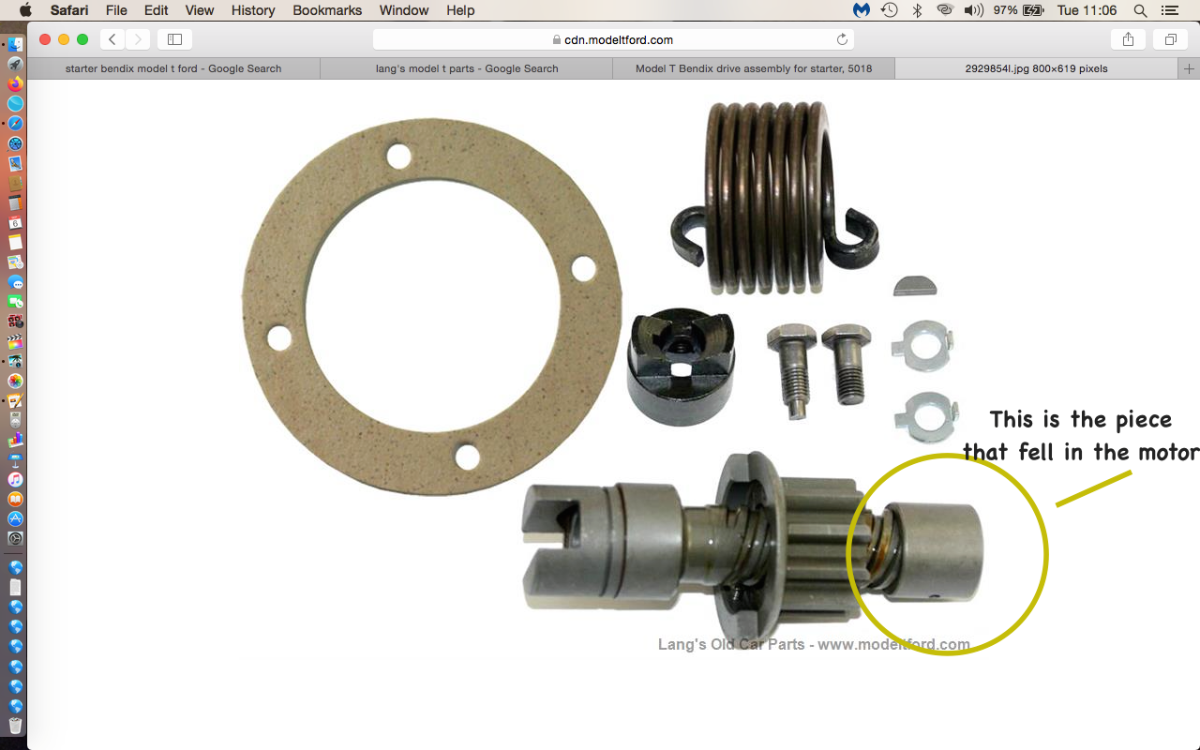 Here is a photo of the bendix from the catalogue. We compared mine to a complete unit we had on hand and saw that the end piece that threads on was missing. I have to address the incredulous comments here and add that my friend and club member helping me had never seen this happen in over 40 years of working on and owning Model Tees. First time for everything, I suppose.